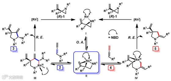 相比于与联烯胺的反应,由于在Table 2和3中,烯基氮杂环丙烷与联烯的[3+2]环加成反应中手性转移效率有所下降(与原料相比降低1-13% ee)且观察到少量[5+2]环加成产物。基于上述实验现象及该小组前期工作基础,最后作者提出了反应的可能机理:首先一价铑催化剂与烯基氮杂环丙烷经氧化加成生成构型保持的铑-氮杂环丁烷中间体II。随后,联烯胺2的内侧双键插入到C-Rh键得到三价铑中间体III。最后还原消除得到3-亚甲基吡咯烷产物3并再生一价铑催化剂完成催化循环。而当使用一般的联烯底物时,在最佳条件B下,中间体II更容易被联烯4的外侧双键捕获得到中间体IV。进而经后续转化而选择性地得到2-亚甲基吡咯烷产物5 (Scheme 4)。