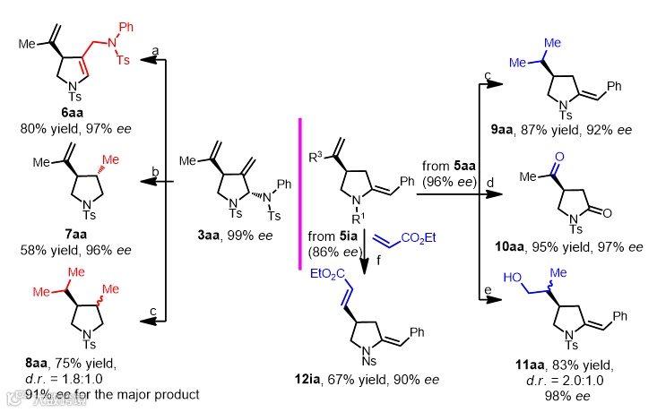 此外,由于得到的亚甲基吡咯烷产物中烯基的存在增加了该类化合物后续官能团转化的可能。如Scheme 3所示的对产物中烯基官能团的转化可见:得到的[3+2]环加成产物可方便地转化为一系列其它取代类型的手性吡咯烷。