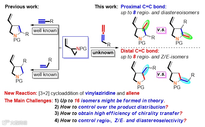 与炔和烯的反应不同,烯基氮杂环丙烷与联烯的[3+2]反应可在产物的2-或3-位引入易于后期官能团化的烯基,从而为制备具有重要合成价值的2-或3-亚甲基吡咯烷化合物提供原子经济性的方法。该反应存在的主要挑战是:理论上该反应至少可以生成16种异构体,如何区域选择性及立体选择性及地合成目标的亚甲基吡咯烷产物以及避免发生相应的[5+2]环加成反应(Scheme 1)?