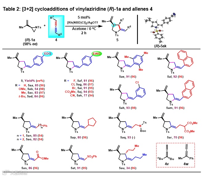 随后,在最优条件B下,作者固定(R)-1a(98% ee)作为底物,对一系列联烯底物的兼容性进行考察。如Table 2所示,各种1-芳基(4a-4m)或1-烷基(4n-4r)取代的联烯以及缺电子的联烯(4s-4t)都可以以中等至优秀的产率以及93-98%的ee值得到相应的2-亚甲基吡咯烷产物。此外,对于1,3-二取代的联烯该反应也适用,只是反应的效率偏低。但遗憾的是该体系暂不能实现与1,1-二取代联烯(4v-4w)的[3+2]环加成反应。产物的绝对构型由(R)-5ak的单晶确定。