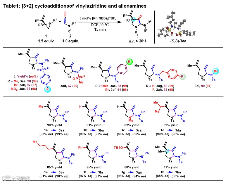 在最佳条件A下,作者首先对烯基氮杂环丙烷的[3+2]环加成反应的底物普适性进行考察。如Table 1所示,各种磺酰基取代的联烯胺(2a-2i)和R3 = 甲基(1a), 氢(1b-1c), 异丙基(1d), 正丁基(1e), 苯基(1f)和OTBS(1g)的烯基氮杂环丙烷底物都可以顺利地得到3-亚甲基吡咯烷产物3(产率:60-95%;ee值:86-99%),且原料的手性完全保留在产物中。值得一提的是:使用烯基氮杂环丙烷底物1h时,利用该方法还可以不对称合成具有全碳季碳手性中心的3-亚甲基吡咯烷产物3ha。产物的绝对构型由(S,S)-3aa的单晶确立。