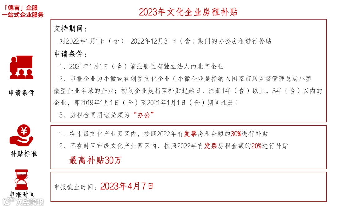 对符合条件的文化企业实际支付的属于2022年1月1日-2022年12月31日期间的办公房租进行补贴。