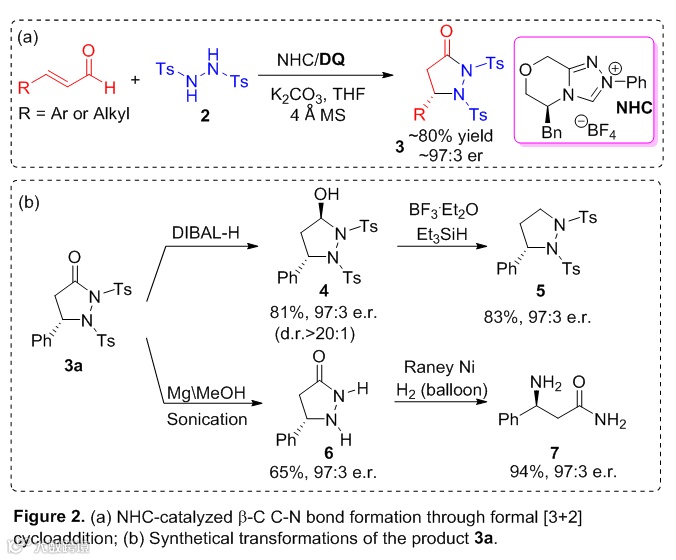 在这一研究工作中,作者通过调控氮的亲核反应活性,发现磺酰基(Ts)保护的肼,在卡宾催化氧化条件下,可以与不饱和醛高效地发生形式上[3+2]反应,高产率高对映选择性地形成新的C-N键并得到吡唑啉酮化合物。这一合成方法有较好的底物普适性,对于各种芳环、杂芳环以及烷基衍生的不饱和醛都可以得到较好的结果(er最高可到99:1)(Figure 2a)。手性吡咯唑酮是一种重要的杂环化合物,作者接下来进行了一系列的产物转化。在一些常规条件下,可以方便地转化成pyrazolidin-3-ol, pyrazolidine五元氮杂环化合物,Ts保护基在Mg/MeOH条件下可以除去,并可高效地得到β-氨基酸衍生物(Figure 2b)。