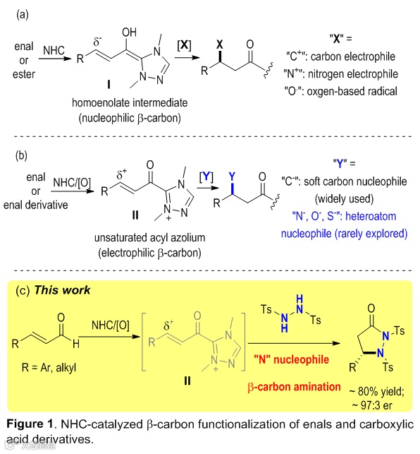 近日,贵州大学和新加坡南洋理工大学的研究人员合作,实现了氮杂环卡宾有机催化策略下的C-N键不对称键构筑及相关功能分子的合成。使用一种典型易得的有机催化剂—氮杂环卡宾(NHC),在氧化条件下通过与不饱和醛反应形成具有亲电性β-碳原子的不饱和acyl azolium中间体(II)(Figure 1c)。这类LUMO活化的活性中间体(II)在卡宾化学中已经有了比较深入的研究,然而主要是用在与活泼的碳亲核试剂的C-C成键反应中(Figure 1b)。含杂原子,如氧、氮、硫的化合物是另一类常用的亲核试剂,然而其用于捕捉这类缺电性的不饱和acyl azolium (II)中间体却鲜有成功。这里面部分的挑战在于这类LUMO活化的卡宾中间体亲核性相对较弱,以及可能存在的酰氨,氧或硫副反应的发生。