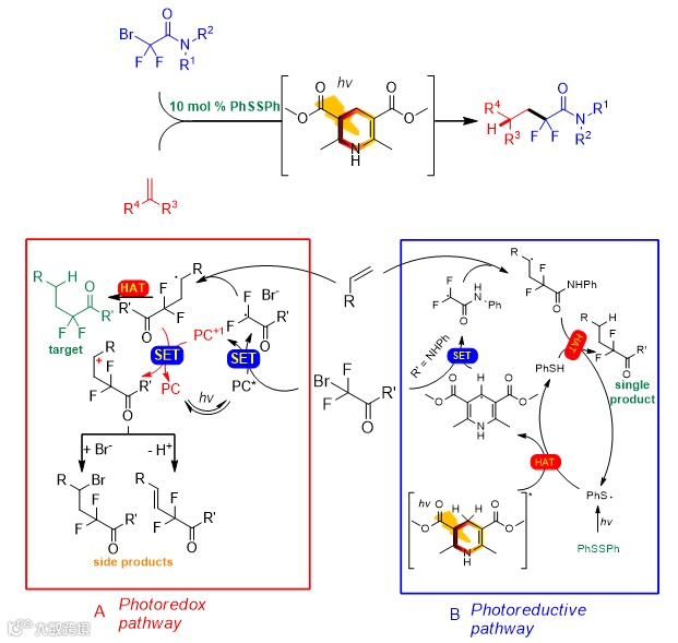 图1 氢二氟酰基化的光氧化还原路径及光还原路径。