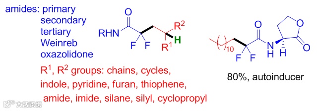 应用这一策略,可以选择性的合成多种氢二氟乙酰化产物,底物适用范围广,反应条件温和,产率优良。此方法同样也适用与生物分子的衍生化,作者对雌酮衍生化后的烯烃进行氢二氟乙酰胺化反应同样取得中等收率。同时使用这一新方法,还简捷高效地一步合成了含有二氟烷基基团的高丝氨酸内酯类化合物(AHLs,一种自诱导物),从而避免了以往的需要使用活泼金属进行催化的偶联反应,为研究高丝氨酸内酯类化合物性能的研究者减少了合成量。