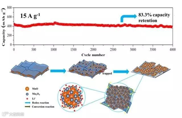 高功率密度是锂离子电池发展的主要方向,也是锂离子电池在大规模储能(电动汽车、储能电站)等领域广泛应用的关键之一。近日,浙江大学姜银珠副教授课题组与澳大利亚Wollongong大学窦世学院士课题组合作设计制备了三明治型“石墨烯-MnO-石墨烯”锂离子电池负极,通过调控电极在循环过程中的结构演变,引入Mn3+/Mn2+表面氧化还原电位对,大幅度提升了赝电容对电极容量的贡献,克服了锂电电极材料受限于锂离子固态扩散控制的储锂机制,最终促进了储锂倍率性能的大幅度提升。该电极在40 A/g(充/放电时间仅为28秒)的超大电流密度下,仍达到331.9 mAh/g的储锂容量,在15 A/g的大电流密度下循环4000次后,容量为379 mAh/g,容量保持率高达83.3%。赝电容储锂机制的引入有望为高功率密度锂离子电池的发展提供新的研究思路和方向。