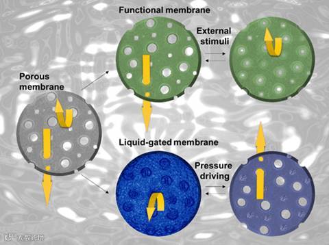 膜是一个选择性的屏障,允许某些物质通过的同时可阻挡其他物质的通过。这些物质可以是气体、液体、分子、离子或其他小的颗粒物中的一种或几种。智能薄膜的设计是基于膜对外界刺激响应显著改变的特性。这些外界刺激通常包括光、压力、pH、温度、湿度、电场及磁场等。多孔膜的门控性质则是指膜孔道的打开和关闭。例如,当一个纳米通道薄膜系统处于打开状态时,它允许离子传输从而实现离子电导。膜的分类方式多种多样,依据来源分为人工合成膜和生物膜,而依据结构分为对称性膜和非对称性膜。人工合成膜依据用途进一步分为致密膜和多孔膜两种。门控膜的现实应用依赖于膜的孔道尺寸和孔道内表面的性质(电荷、表面能、浸润性等)。依据膜孔道尺寸的大小,门控膜又可分为纳孔门控膜、微孔门控膜和大孔门控膜三种。