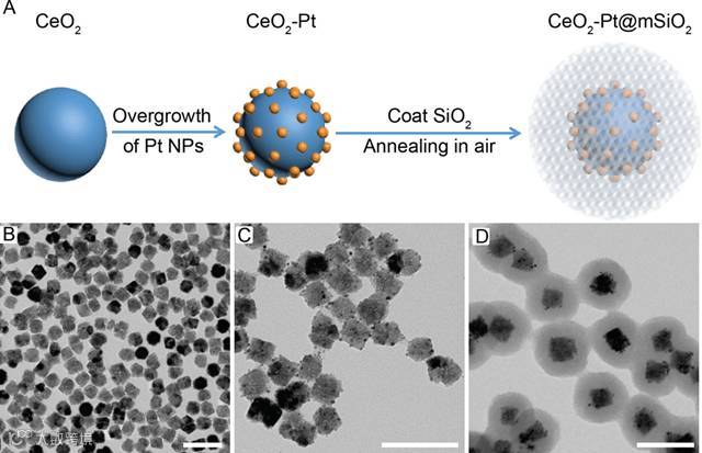 图3. CeO2-Pt@m-SiO2的合成以及相应的TEM照片。Scale bar为100 nm。图片来源:JACS
