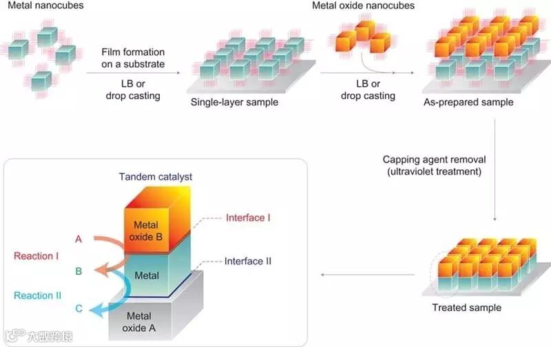 第一项开创性的工作来自一篇发表于2011年的Nature Chemistry(Nanocrystal bilayer for tandem catalysis. Nature Chem., 2011, 3, 372)。这篇文章的基本思路是试图通过构建两个不同的金属-氧化物界面来实现耦合在一起的反应单元,从而实现串联反应。如图1所示,通过纳米晶自组装的方法,在一个基底上覆盖两层均匀的纳米晶。之后把表面活性剂脱除,就可以得到两个反应界面。在这篇文章中,作者设计的材料是CeO2/Pt/SiO2复合物。首先,单层的Pt纳米立方块被负载到SiO2的平面上。之后,几乎一样尺寸的CeO2立方块作为第二层材料也用同样的方法负载上去。通过紫外光照射能够除去包裹在纳米晶表面的配体,这样就得到了一个类似三明治结构的复合材料。