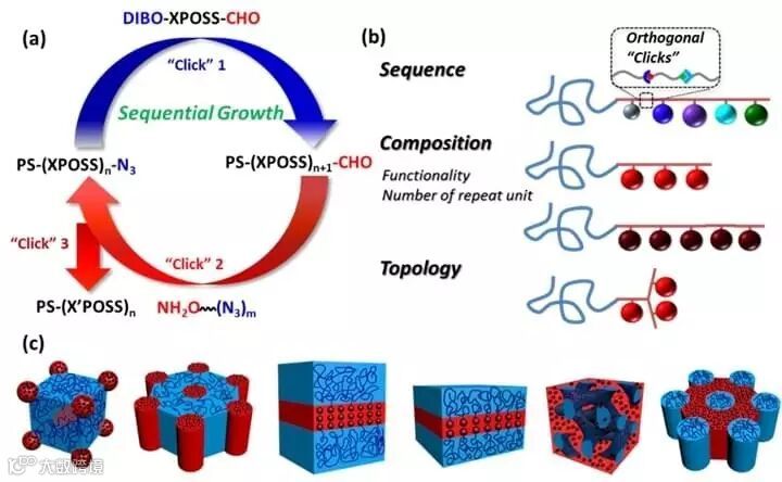 近日,美国阿克伦大学程正迪教授课题组报道合成了具有精确序列的巨型分子(giant molecules)。这些巨型分子由具有精确形状和表面官能基团的多面体倍半硅氧烷(POSS)纳米粒子按照特定的连接顺序构成。通过在POSS上引入两个互不干扰的“点击化学”正交反应位点(如同乐高积木中不同类型的两种接口一样),通过数次交替的“点击化学”反应(图1a),可以把一定数量的纳米粒子按照原定设计准确的接在聚苯乙烯高分子链的末端。