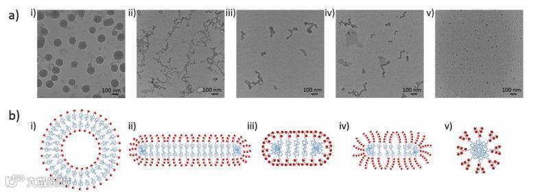 在溶液中,由于这些大分子的化学成分和拓扑结构的区别,使得亲水部位和疏水部位的截面积各不相同,从而能形成不同的胶束形貌。考虑到制备得到的大分子中纳米粒子头部的形状相对固定,因此用它们来研究大分子化学结构和超分子组装结构之间的联系比用传统嵌段共聚物更清楚和系统。简而言之,当这些巨型分子中亲疏水部分相当时,分子倾向于组装成双分子层囊泡。当亲水头部数量增加时,亲疏水部分截面积也相应增加,分子倾向于形成柱状和球状。这种亲疏水部位相对截面积对超分子组装结构的影响,在直链和支链的同分异构体中表现得更为明显。这个工作证明了这类大分子的溶液组装行为能够通过的改变其化学成分和拓扑结构来调控,对将来设计具有其他功能化的这类有机-无机杂化表面活性分子有一定的指导意义。