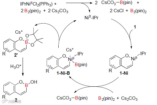 随后,作者对反应机理进行了研究(Scheme 2)。首先Cs2CO3调节B2(pin)2还原Ni(II)催化剂得到IPr-Ni(0)物种,其与1对C-O键氧化加成得到Ni(II)中间体1-Ni,之后通过和B2(pin)2转金属得到1-Ni-B,C-B键还原消除得到产物2a’,2a’经过酸解可以得到终产物2,并且2a’在反应体系中会析出,可以通过过滤得到,使用CD3CN作溶剂,可以得到其1HNMR数据。