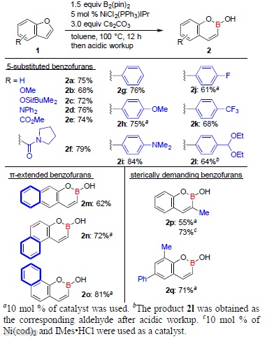 经过条件筛选,作者得到最优条件为:NiCl2(PPh3)Ipr做为催化剂,B2(pin)2为硼源,Cs2CO3为碱,100 ℃在甲苯中反应(Scheme 1),通过酸化猝灭反应,最终得到2a为主要产物。并且其结构也通过了1H、13CNMR,HRMS和X-ray 晶体衍射的确认,并且被没有检测出之前文献中报道主要发生烷基化/芳基化的副产物(E)-2-[2-(频哪醇硼酯基)乙基]苯酚。在此基础之上,对底物苯并呋喃1的普适性进行了研究(Scheme 1)。首先,在Ni催化剂下很容易发生反应的酯基、甲氧基、F等官能团都具有有很好的耐受性(2b, 2e, 2h, 2j);可能发生脱硅基保护的硅醚类底物也能够得到目标产物(2c);含缩醛、二级胺等官能团底物也能够反应。此外,将π-系统延伸到萘环,反应收率也理想(2m-2o)。虽然2-位取代的底物由于位阻反应产率较低,但是由位阻较小的配体IMes代替IPr,也能够得到73%收率(2p);7-位取代的苯并呋喃,提高催化剂的用量到10%,也能够得到理想的收率(2q)。