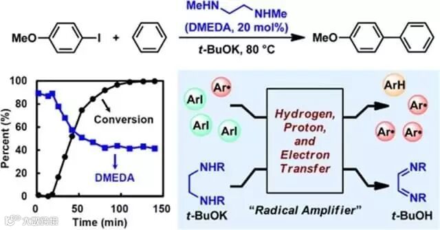 以1,2-二胺添加剂为模型反应研究得到的引发机理同样可以帮助人们理解使用类似的有机小分子类化合物,如醇类,1,2-二醇,2-氨基醇等化合物可以有效促进无过渡金属偶联反应的原因。同时,对这一反应体系机理的深入理解也为有机化学工作者设计新型无过渡金属偶联反应及新型自由基反应提供了一定的理论依据。