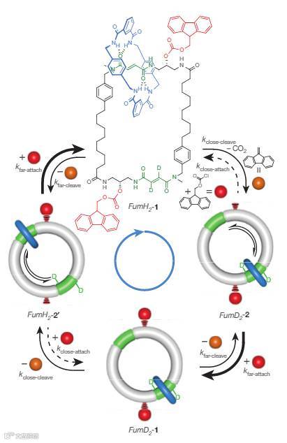 这项工作的最精妙之处就在于如何控制“移动”大环的运动方向,关键就在于控制Fmoc基团的结合和移除。Fmoc从轨道上移除的反应速率是固定的,但结和的反应速率却不一样。当稍小的“移动”大环结合在“轨道”大环的结合位点上时,其附近的Fmoc-Cl结合位点与Fmoc-Cl的反应速率,要低于轨道另一端的Fmoc-Cl结合位点。也就是说,如果“移动”大环在“轨道”大环上顺时针移动,Fmoc“栏杆”总是倾向于结合在远端,不影响移动方向;如果“移动”大环在“轨道”大环上逆时针移动,它将总是倾向于遇到Fmoc“栏杆”,不能继续。