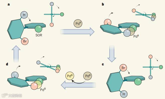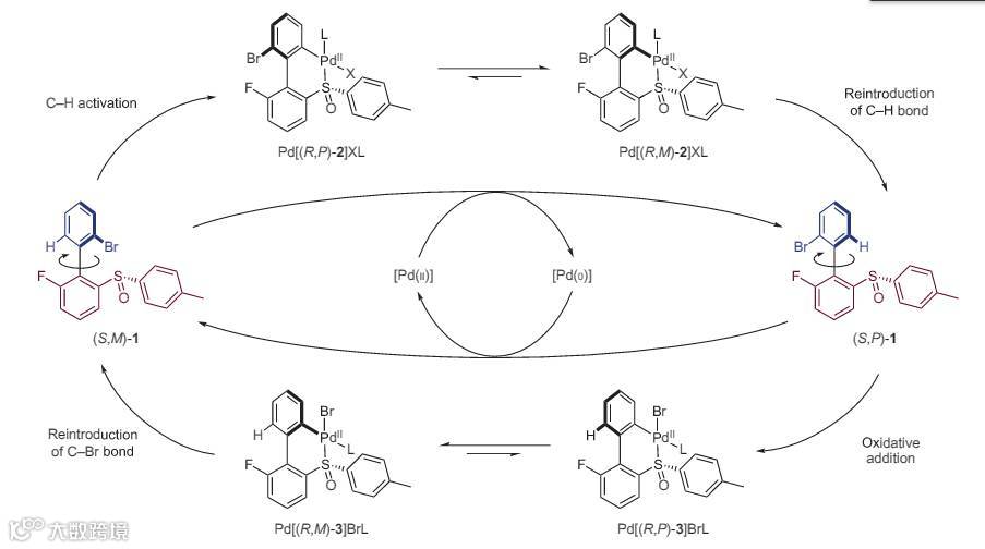 虽然新的工作还是需要条件不同的四个步骤来一次完整的360°旋转,但关键的反应——碳氢键活化和氧化加成都依赖钯催化剂。钯络合物可以与碳碳键“转轴”上下方的芳香环都结合,其中两个关键的化学过程都可以让上面的环相对下面的环转动180°,由此完成一次完整的旋转。