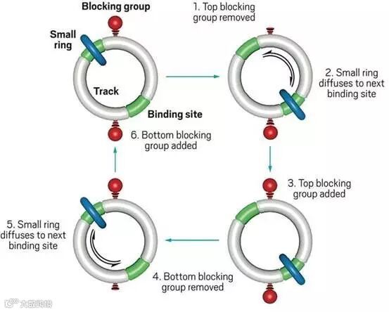 Leigh和Feringa的团队都是在2000年前后开始研究小分子发动机。Leigh小组的相关成果首次发表2003年(Nature, 2003, 424, 174-179, DOI: 10.1038/nature01758),他们使用的是被称为索烃(catenane)的两个互扣的大环状分子。Leigh小组这次依然使用了索烃,而且结果也依然发表在《Nature》上。(An autonomous chemically fuelled small-molecule motor. Nature, 2016, 534, 235-240, DOI: 10.1038/nature18013)
