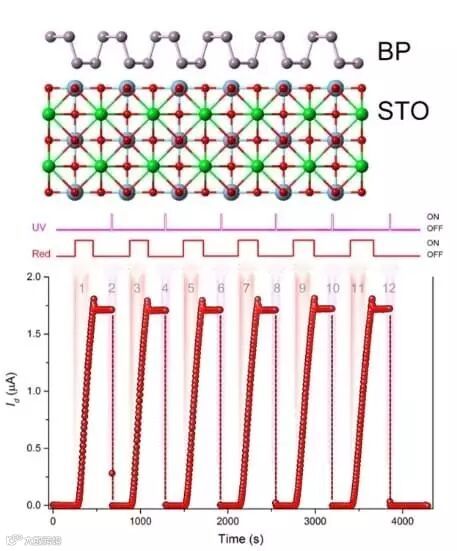 将一种二维材料与其他材料通过范德华力相结合形成范德华异质结,能够获得单个二维材料不具有的特殊性能。最近,新加坡南洋理工大学刘政课题组将二维黑磷与钛酸锶氧化物衬底相结合,制备出多功能的光电器件。异质结器件表现出了良好的持久光电导效应,光电导在低温以及黑暗环境中几乎观测不到弛豫。同时光电导的大小可以通过不同波长的激光进行调控。紫外照射,可以使器件处于OFF状态,而可见的红光能够使器件处于ON状态,ON/OFF比可以达到105量级。