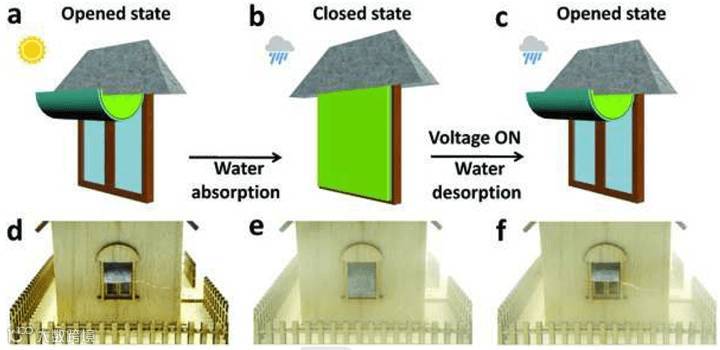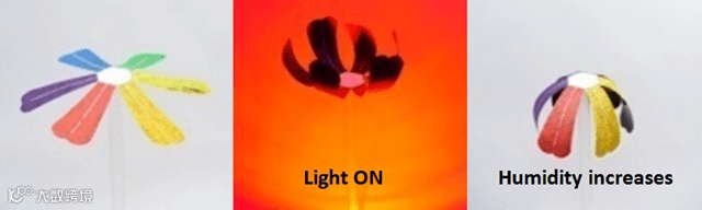 通过精妙的结构设计,他们进一步制备出可实现模仿花朵开放和闭合的仿生花,以及能够在晴天保持开放,阴雨天自动闭合或通过电动控制闭合的智能窗帘。以上成果为新型低成本致动材料在仿生器件、智能家居等方面的应用提供了重要思路。