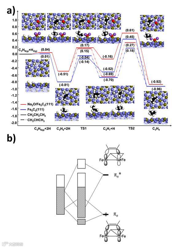 深入研究发现钠在这一体系中起到了至关重要的作用,一方面钠会有效促进铁的活化过程生成反应的活性相Fe5C2物种,另一方面钠在催化剂活化过程中会从体相迁移至铁的表面,传递电子给Fe而修饰Fe5C2的电子结构。而碳化铁电子状态的改变会直接影响反应中间体在催化剂表面的吸附和加氢行为:在含钠的表面烯烃会快速脱附,而在不含钠的表面烯烃会更倾向于加氢生成相应的烷烃。 这一结果一方面有望实现工业化水平的合成气制烯烃过程,另一方面对于产物选择性调控过程的研究有助于深入理解费托合成机理,指导新催化剂的设计。