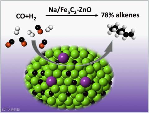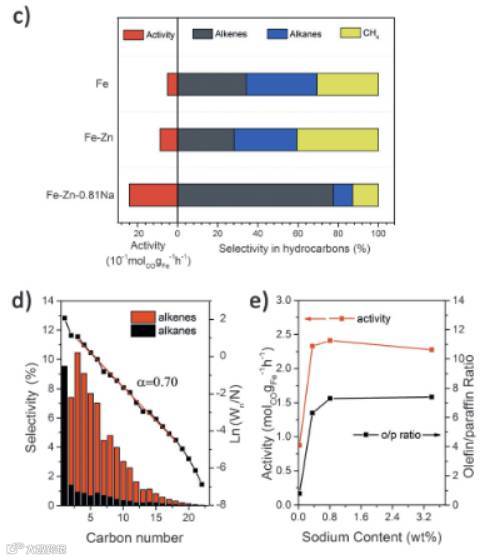 北京大学团队开发的高温费托合成催化剂非常好的填补了这方面的不足。他们使用含钠的铁锌基催化剂,在340 ℃、2 MPa的条件下在烃类产物中可以得到78%的烯烃,其中主要以高碳α-烯烃为主。同时甲烷的选择性只有8%。水汽变换过程受到明显抑制,CO2的选择性被控制在25%以内,碳在这一过程中的有效利用率可以达到64%,烯烃的时空收率超过4000 mg/gcat h。使用的铁催化剂价格低廉、合成方法简单,在工业化上具有非常高的应用潜力。