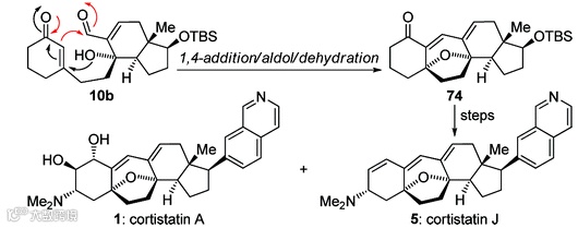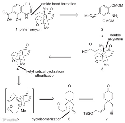 值得一提的是,这是Platensimycin分离鉴定后仅仅四个月后就完成的首例全合成,其关键反应包括以钌催化的烯炔环化异构化反应、二碘化钐介导的自由基串联环化反应/成醚反应构建笼状骨架,以烯烃交叉复分解反应和酰胺键形成反应等完成了全合成。