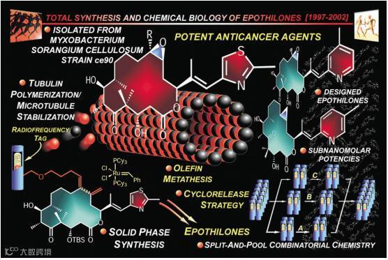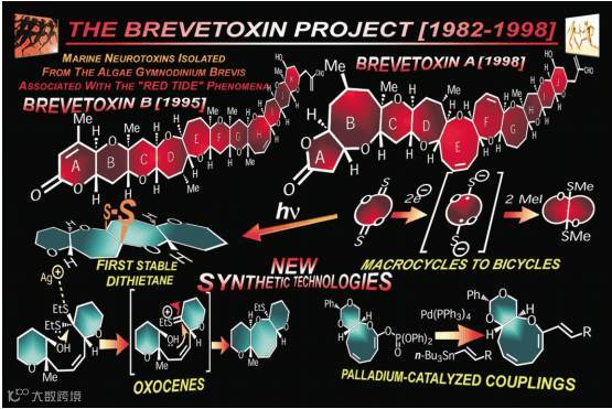 Brevetoxin A的全合成中发展并使用了许多构建中环体系环醚的反应(Nature, 1998, 392, 264)。而Epothilone A的全合成中用了RCM反应构建大环体系(那时候烯烃复分解反应还没有获得诺贝尔奖),这也为后来大环内酯或者大环内酰胺的构建提供了方法,并且用到了固相合成和组合化学,这对多样性合成和生物活性筛选具有重要意义。