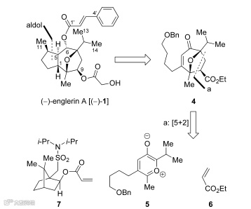 Englerin A的合成策略:以[5+2]环加成反应为关键步骤构建了含有氧桥的七元环,Aldol反应构建了5-7并环,完成全合成。