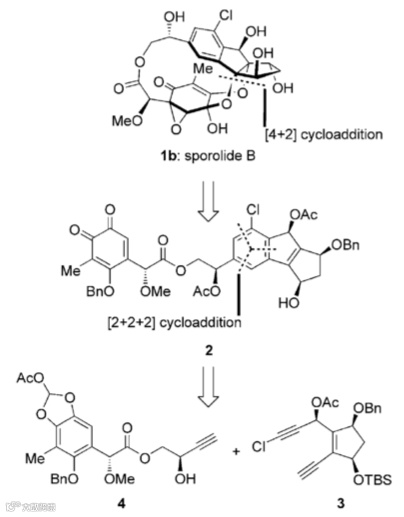 关于Sporolide B的全合成工作被收录在Nicolaou教授所著的Classics in Total Synthesis III中。其关键步骤包括钌催化的[2+2+2]反应构建多取代的苯环、邻苯醌的[4+2]环加成反应等。