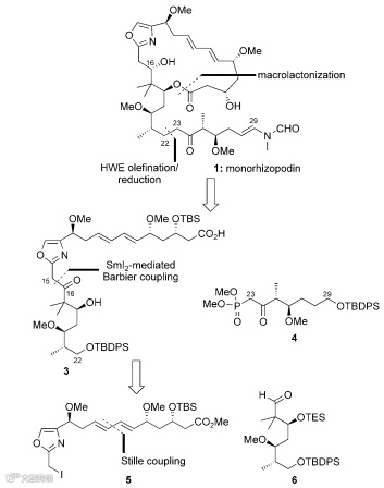 姜雪峰博士,华东师范大学化学系教授。2008-2011在斯克里普斯研究所跟随K. C. Nicolaou教授做博士后研究。期间主要工作是Monorhizopodin和16-epi-Monorhizopodin的全合成及生物活性研究(Angew. Chem. Int. Ed., 2011‚ 50‚ 1139-1144),Nature Chemical Biology还对该工作进行了专题报道(Nat. Chem. Biol., 2011, 7, 128-129)。合成策略如图所示,以Stille偶联反应、二碘化钐介导的Barbier反应、HWE反应及大环内酯化反应为关键步骤,合成了Monorhizopodin和16-epi-Monorhizopodin。