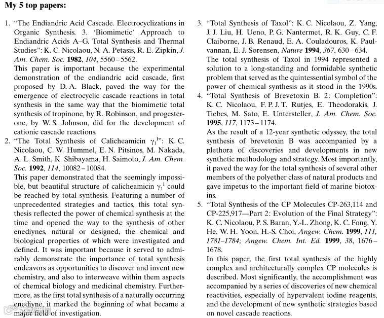 K. C. Nicolaou教授发表了一千四百多篇的科研论文,其中有一些非常经典的有机合成化学展望以及重要反应在天然产物全合成中应用的综述,值得学习和推荐。