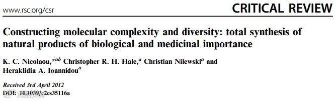 这篇综述写于2000年,由K. C. Nicolaou教授及其弟子D. Vourloumis、N. Winssinger以及Phil S. Baran撰写,长达78页,回顾了整个天然产物全合成的发展史,并为新时期的天然产物全合成做出了展望,是有机合成化学人士必读的一篇综述。