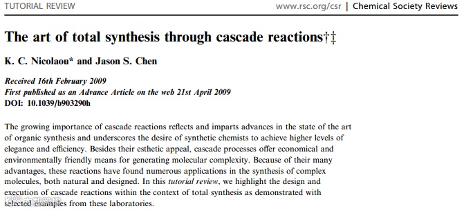 8. "The art of total synthesis through cascade reactions" Chem. Soc. Rev., 2009, 38, 2993-3009
