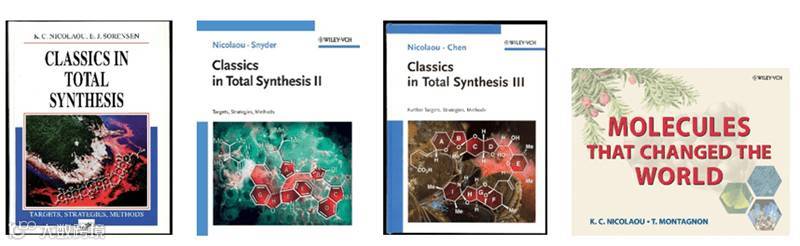 除了综述,K. C. Nicolaou教授也有许多经典的著作,首先就是三本Classics in Total Synthesis《全合成经典》,选取了一些复杂天然产物的明星分子,如马钱子碱、利血平、紫杉醇、万古霉素等等,从大的策略层面以及小的化学反应及立体化学控制等方面详细解读了这些分子的合成路线,是学习有机反应、鉴赏经典全合成的理想教材。Molecules That Changed The World则更侧重于科普,回顾了有机合成的发展,简要介绍了一些经典分子的发现、合成以及对人类生活的影响,这本书图文并茂,可以看到许多明星分子、化学大咖、经典反应,也是了解和学习有机合成化学的经典之作。