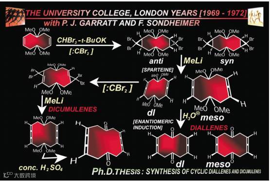 1972年,K. C. Nicolaou教授在伦敦大学学院获得博士学位,师从F. Sondheimer和P. J. Garratt教授,期间主要工作是环状联烯与环状累积三烯的制备,以及用鹰爪豆碱sparteine进行不对称诱导的研究。在一篇自传性的综述里(Tetrahedron, 2003, 59, 6683-6738),Nicolaou教授回顾了他的教育经历以及工作后至2003年的全合成工作。