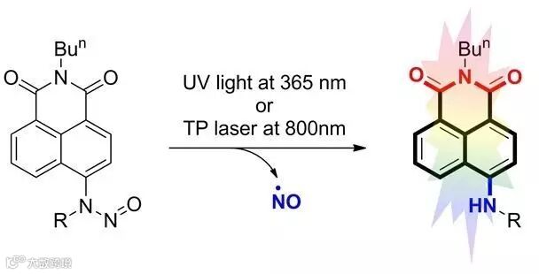 面向一氧化氮化学生物学,开发各类小分子化学工具是华东理工大学药学院杨有军课题组的一个研究方向。他们于近期在美国化学会旗下杂志《Anal. Chem.》报道了一系列新型一氧化氮供体。这些供体本身不发荧光,经365 nm紫外线照射后分解释放出一氧化氮,并同时释放一个萘酰亚胺荧光团。因此便于利用各类荧光技术,对一氧化氮在生物体系内的释放位点、释放速率和释放总量进行实时定量监测。较传统的一氧化氮供体,该系列新型光控、光计量的一氧化氮供体在一氧化氮生物学的机制研究中有极大的优势,有较广泛的应用潜力。本工作的第一作者是张子谦博士,并获得了大连理工大学肖义教授的大力协助。该工作在国家自然科学基金的大力支持下完成。