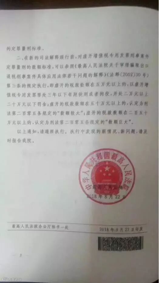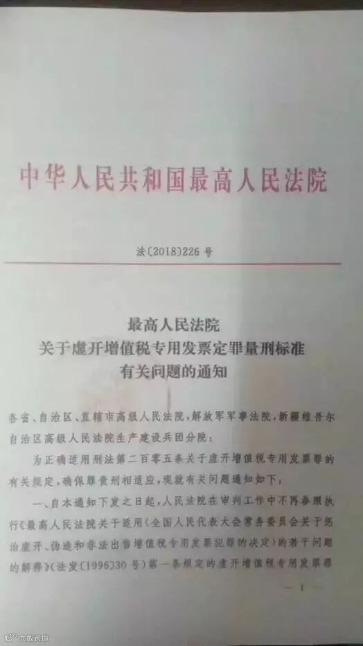 最高人民法院印发《关于虚开增值税专用发票定罪量刑标准有关问题的通知》(法[2018]226号)!以司法解释的形式修正了虚开增值税专用发票罪的量刑标准!250万,就可以判到无期徒刑!