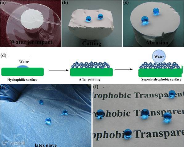 与通过表面处理得到的超疏水材料相比,该材料具有整体的超疏水性,可以任意的刮擦、切割及长时间抵抗快速水流的冲击。此外,在不同的苛刻环境下(高温高湿,强酸碱及紫外辐照)具有优异的综合稳定性。有趣的是,该材料可以像粉笔一样,通过简单擦涂的方式,使得不同基底材料(纸张、织物和手套等)具有超疏水性能,提供了一种快速大规模制备超疏水表面的方法。绿色的合成策略,多功能性及优异的综合稳定性使得该材料具有潜在应用价值。
