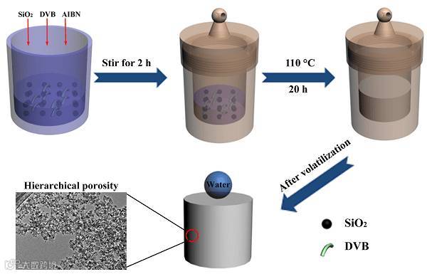 图1.稳定超疏水多级孔聚合物的一锅法无模板制备。