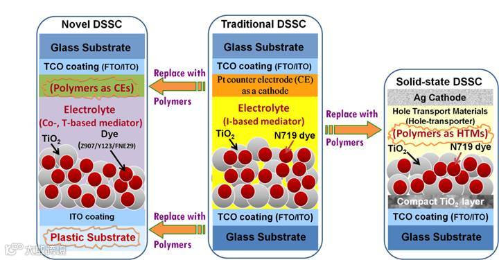 西安建筑科技大学功能材料研究所云斯宁教授与巴西坎皮纳斯大学、西班牙阿文戈亚太阳能公司、复旦大学等各国科研人员合作撰写长篇论文“Dye-sensitized solar cells employing polymers”,详细地讨论了聚合物作为电池组件在DSSCs中扮演的角色。一方面,导电聚合物优异的性能特点有望取代昂贵的铂催化材料而广泛的应用于DSSCs对电极催化材料。这能有效解决贵金属铂材料在新能源领域面临的压力与挑战(成本高、资源有限、易腐蚀等);另一方面,聚合物作为固态或拟固态电解质有望取代液态电解液应用于固态或全固态太阳能电池,解决液态电解液泄露问题,进而大幅度提高太阳能电池的稳定性和使用寿命。此外,聚合物利用其柔性的特点取代刚性玻璃衬底应用于柔性太阳能电池,进一步拓阔了DSSCs潜在的应用范围(如太阳能窗户、太阳能屋顶、BIPV玻璃、便携式电子设备、内饰件、平板显示、太阳能雨棚、太阳能雨伞、太阳能广告/海报、无线传感器网络、应急电力、集成器件等)。