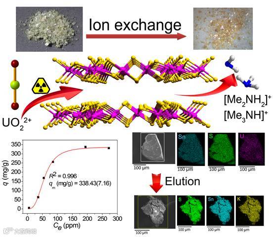 近日,中国科学院福建物质结构研究所结构化学国家重点实验室黄小荥课题组与美国西北大学化学系Prof. Mercouri G. Kanatzidis合作,利用硫属化合物结构中的路易斯软碱S2-对UO22+离子的亲和力,以及有机胺阳离子的尺寸可调和构型柔性的特点,创新性地在硫属化合物离子交换材料体系中发展了首个以有机胺阳离子交换UO22+离子的硫代锡酸盐FJSM-SnS,其具有优越的耐酸碱性,对UO22+离子具有较高的吸附量,达到338.43 mg/g,超过了商用的离子交换树脂。并且FJSM-SnS对UO22+离子具有良好的选择性,即使在高浓度Na+、Ca2+或HCO3-存在的情况下,该离子交换剂仍然对UO22+离子具有良好的去除能力,对恒量的UO22+离子也可以保持非常高的去除率(接近100%)。更为有意义的是,吸附的UO22+离子能够通过简单、环境友好的方法将其洗脱下来,即将负载UO22+的产品浸泡在高浓度的KCl溶液中即可达到洗脱的目的。因此,FJSM-SnS作为铀去除剂具有如下优点:(i)低值、容易合成;(ii)优越的耐酸碱性;(iii)较高的铀去除效率;(iv)容易、便宜、高效的洗脱能力。故FJSM-SnS在去除和回收放射性铀方面具有潜在的应用。这项研究也进一步证实UO22+是比以前人们认为得更软的路易斯酸离子(传统上人们认为UO22+是路易斯硬酸)。