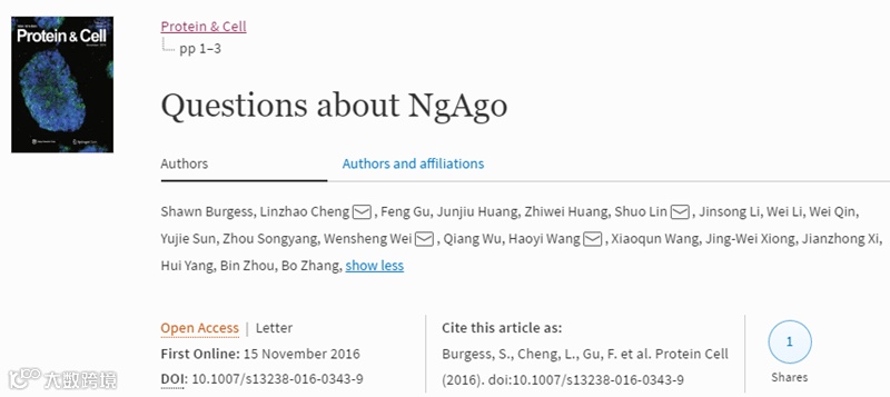 Springer旗下期刊Protein & Cell于11月15日以Letter形式在线发表题为“Questions about NgAgo”的文章,质疑韩春雨等人之前在Nature Biotechnology上发表的NgAgo基因编辑技术。英文学术月刊Protein & Cell由高等教育出版社、中科院北京生命科学研究院和中国生物物理学会联合创办,由Springer负责海外发行。于2010年11月进入Medline数据检索系统,2012年11月进入SCI引文数据库,最新影响因子3.817,主编为清华大学饶子和院士。