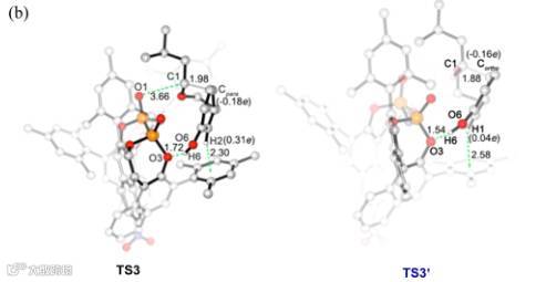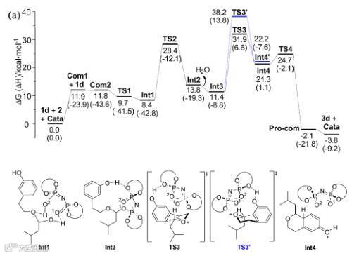 作者也通过DFT计算的方法对反应机理和选择性进行了解释。首先,手性磷酸催化剂和苯乙醇以及醛底物形成氢键,进而形成半缩醛,可以看出苯乙醇底物中苯环上的羟基也和手性磷酸催化剂有氢键作用,促进了反应的进行。接着,就是苯环对氧鎓离子的进攻,相对酚羟基来说,有邻位或者对位两种,即TS3和TS3'。其中TS3过渡态能量较TS3'能量低,而从静电势角度来看,也是对位的大于邻位的,即对位亲核性要大于邻位的,再加上键长方面的证据,可以得出,主要还是对位产物为主。(详情请阅读SI)