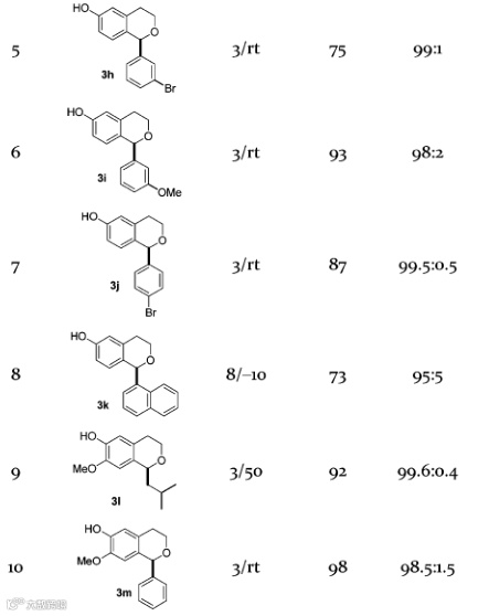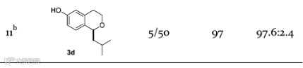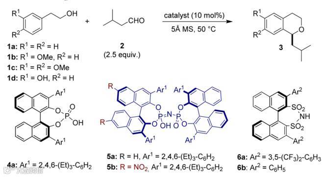 首先,作者以苯乙醇或者其苯环取代的衍生物和异戊醛反应,对底物和催化剂进行了筛选,作者发现,只有当苯乙醇的苯环上R1为羟基时,由于其可以和手性磷酸形成氢键,才可以发生反应,否则不能反应(图2中,entry 1-4)。选定了底物之后,就是对催化剂的筛选,带有磷酰亚胺结构的二磷酸盐催化剂给出了中等的收率和80:20的er值。而苯磺酰亚胺类催化剂6a和6b虽然产率较高,但只得到了几乎消旋的产物。最后作者发现,当在苯环上引入硝基时,增强了催化剂的酸性,进而提高了产率,也提高了对映选择性,这也是该文章题目特别强调的硝基限制的带有磷酰亚胺结构的二磷酸盐催化剂。