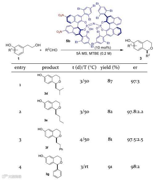 有了最佳反应条件:以10 mol%的5b为催化剂,MTBE为溶剂,室温或者50度反应,其中的醛可以是脂肪醛也可以是芳香醛,十几个底物都取得了非常优秀的产率和er值。当催化剂的量从10 mol%降为5 mol%时,反应时间从原来的3天延长到5天,但产率和er都能保持。