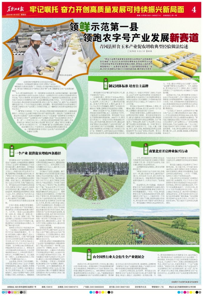 文章来源:黑龙江日报,作者:宋伟东 董新英,原标题为《领鲜示范第一县 领跑农字号产业发展新赛道——青冈县鲜食玉米产业促农增收典型经验做法综述》。