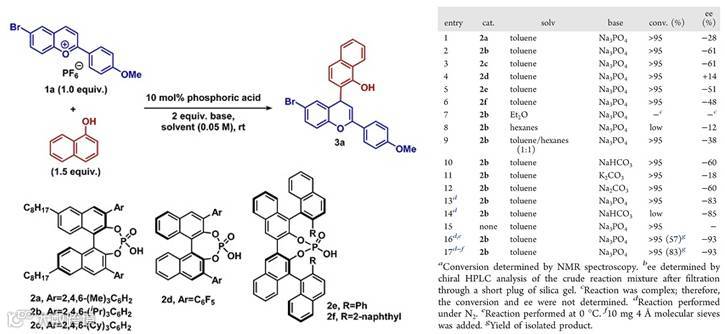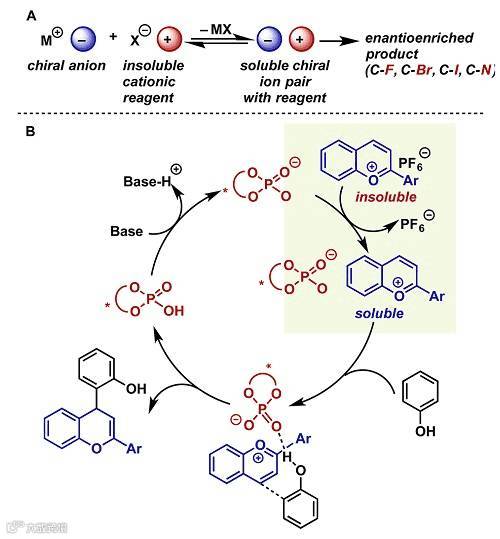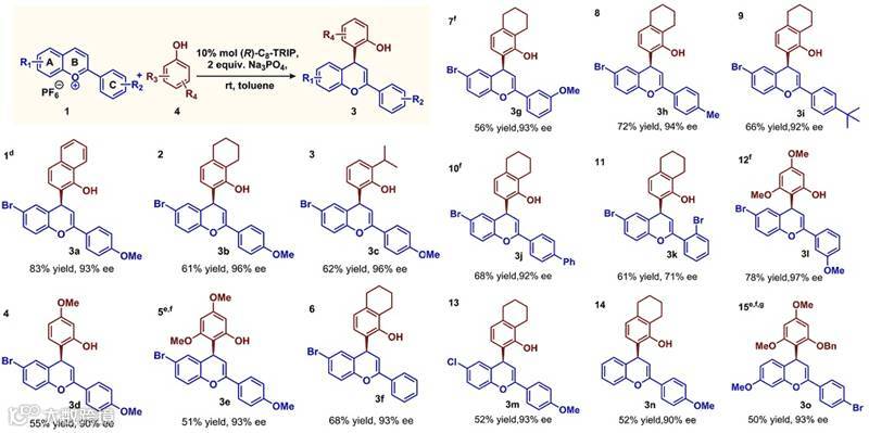 仿生合成黄酮类化合物要求催化剂能够促进亲核试剂对苯并吡喃的平面正离子进行立体选择性加成,非常具有挑战性,一般催化剂很难实现该类反应。研究小组将注意力集中在手性阴离子相转移催化剂,该类催化剂已经广泛应用到对映选择性地构建C-F、C-Br、C-I和C-N键中(Scheme 2A)。受这些工作的启发,研究小组认为手性阴离子催化剂与不溶的苯并吡喃盐进行阴离子(PF6-)交换,得到溶解的手性离子对,然后接受苯酚进攻,通过阴离子手性环境诱导作用,高对映选择性地得到目标产物(Scheme 2B)。