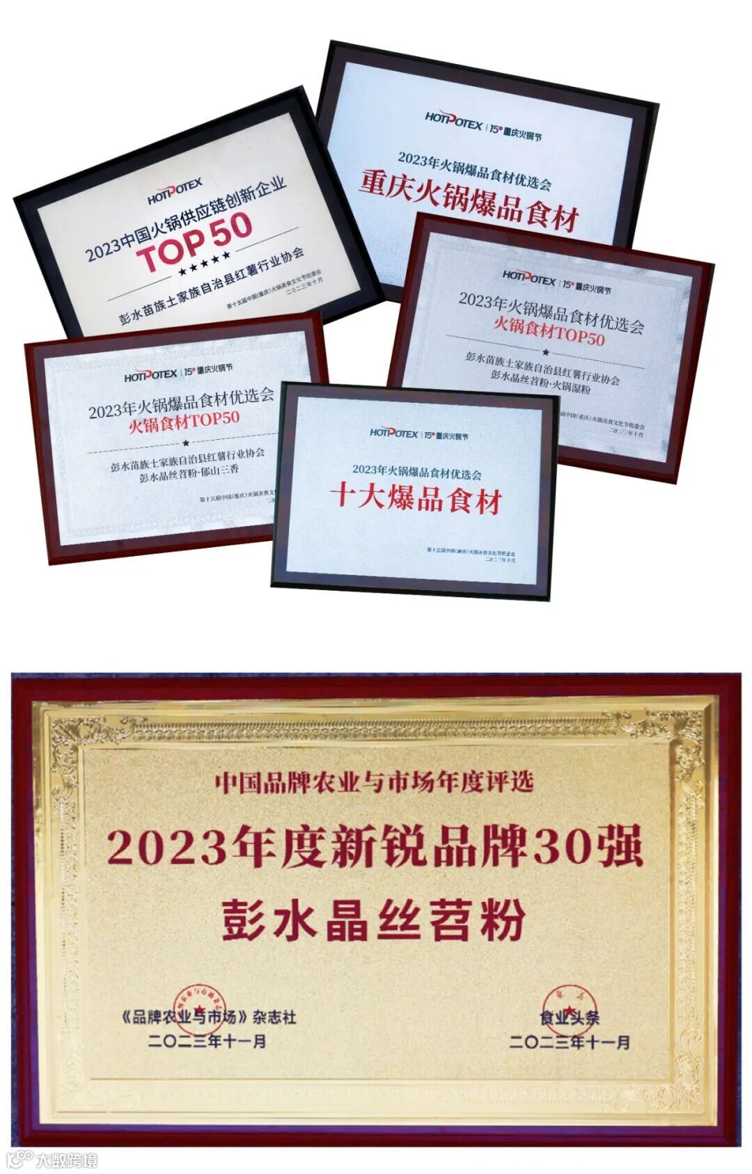 2023年,“彭水晶丝苕粉”进入跨越式发展的新时期。2023年5月,“彭水晶丝苕粉”入选了全国名特优新农产品名录。2023年10月,“彭水晶丝苕粉”以全新的品牌形象重磅亮相第十五届中国(重庆)火锅美食文化节,并荣获重庆火锅“十大爆品食材”等4项殊荣5个奖项,吸引了全球火锅人的目光,成为备受火锅消费者追捧的优质食材。2023年12月,《重庆市彭水自治县:品牌赋能 抓红薯产业推进乡村振兴》入选人民网2023年乡村振兴创新案例。