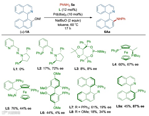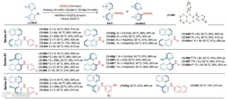 杂双芳环的不对称氨化反应的挑战性在于反应条件的选择。首先,为了得到很好的反应活性,强碱是必需的,这就涉及到其与杂双芳环三氟甲磺酸酯的兼容性问题。其次,IAN胺很容易消旋,这就需要特别温和的反应条件。为了把原料的水解可能性降到最低,作者使用全氟丁基磺酸酯1A和苯胺5A作为模板底物,使用叔丁醇钠作为碱,甲苯作为溶剂,Pd(dba)2作为钯源,60 ℃作为反应温度对配体进行筛选,最后发现,L9a得到的结果最好(45%产率和87%ee)。随后,作者筛选了一些L9a的类似物,还对底物,温度,碱等进行了筛选,得到的最佳反应条件是:3A(溴代物)作为底物,叔丁醇钠作碱,L9a作为配体,50 ℃(Scheme 2)。